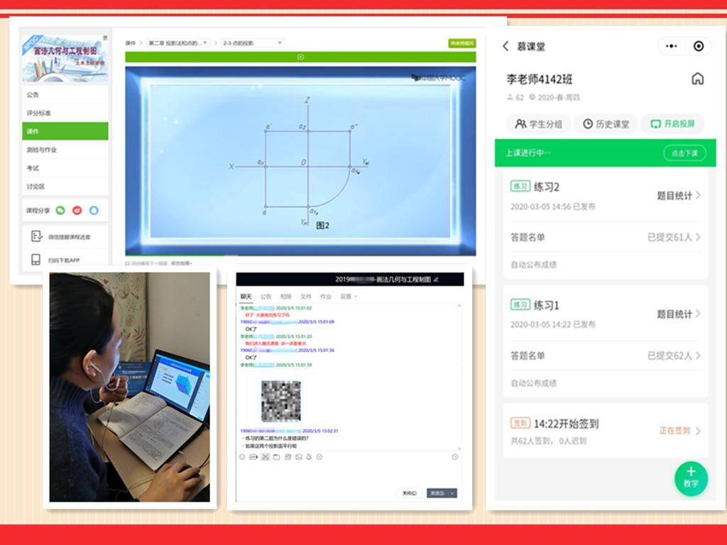 本学期建筑工程系李娜副教授承担《画法几何与工程制图》课程教学任务,她通过中国大学MOOC、腾讯课堂、QQ群等网络平台和工具精心组织在线教学:先利用中国大学MOOC平台的课程资源建立本校异步SPOC课程,并根据教学进度提前发布教学内容方便学生在线学习,上课时学生扫码进入课堂签到参加课程学习、并完成随堂练习,她根据学生随堂练习的答题情况了解学生对课程知识点的掌握情况,随后使用腾讯课堂进行在线讲解,帮助学生进一步理解消化本课程的知识点,课后她通过QQ群布置作业并对学生进行课后答疑。
