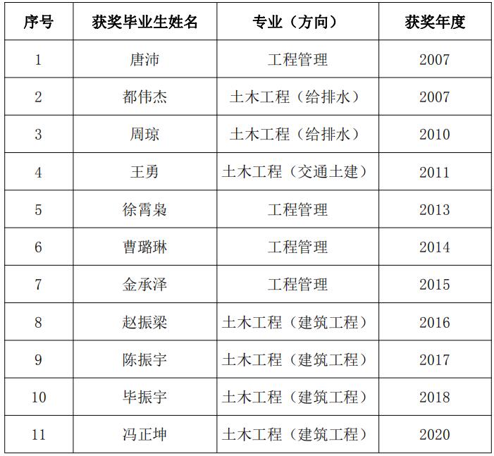 2007年以来我院已有11名土木工程专业和工程管理专业的优秀毕业生获得中国土木工程学会高校优秀毕业生奖,获奖人数位居国内同类高校前列。