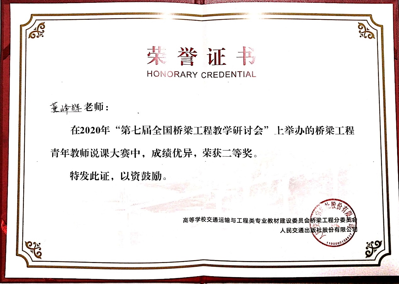2020年11月20日至22日,第七届全国桥梁工程教学研讨会暨桥梁工程青年教师说课大赛在湖南长沙举行,来自全国32所高校的39位桥梁工程青年教师参加了本次说课大赛,我院交通土建工程系董峰辉老师参加了大赛并获得了二等奖。