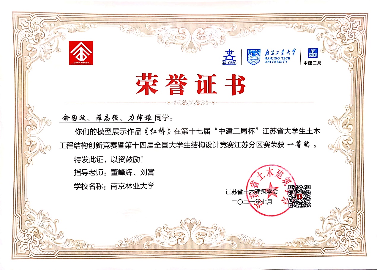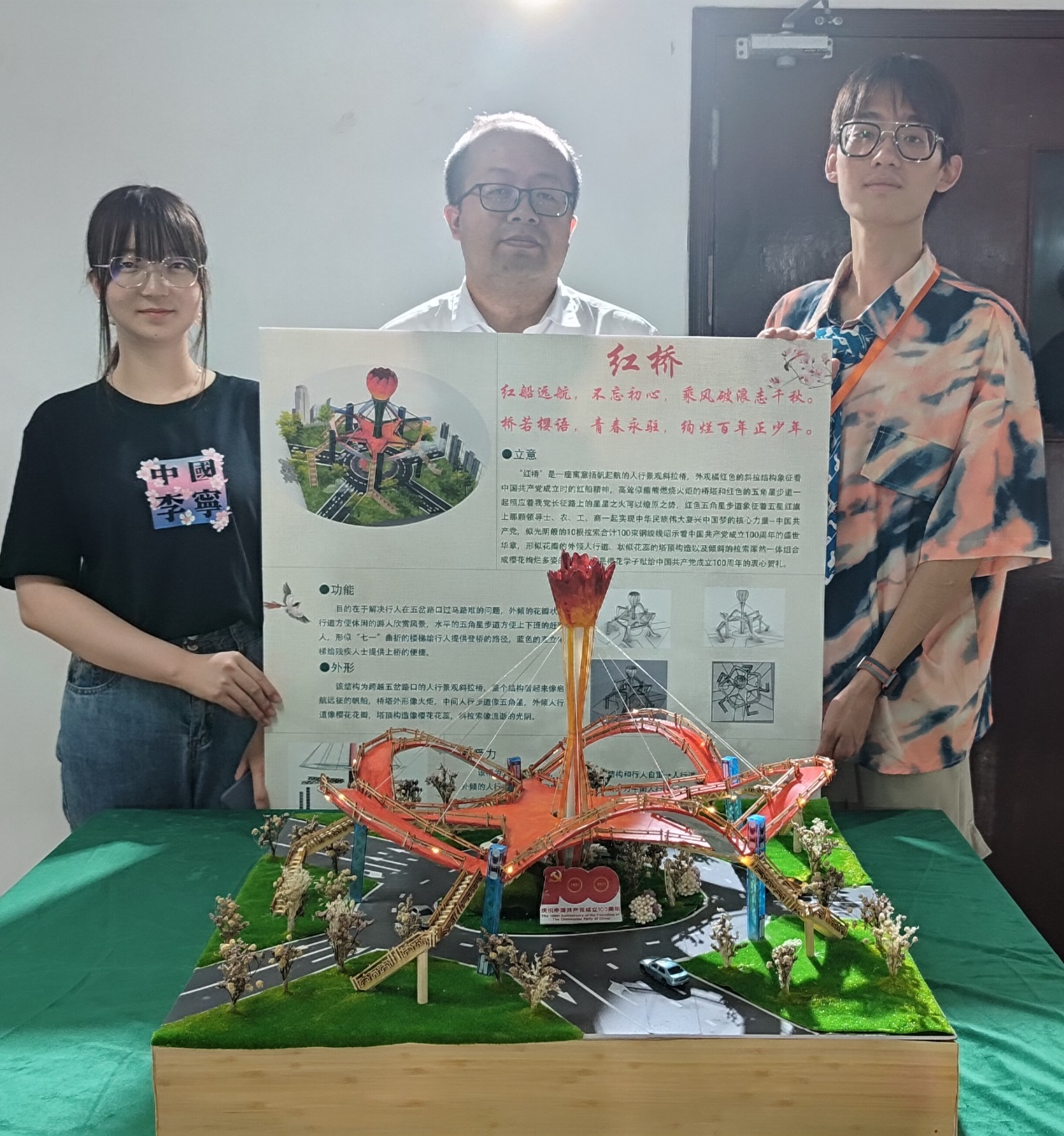 大学生结构设计竞赛是土木工程领域级别最高、规模最大的学生创新竞赛活动,被誉为"土木皇冠上最璀璨的明珠"。我校在土木工程学院科协和团委的精心组织下,全程参与了一个模型加载组和两个展示组的比赛。在副院长戴兆华、院党委副书记兼副院长柳任飞、院办主任王海燕、院团委书记兼学工办主任潘玉芹等领导的统筹规划下,在我院董峰辉、郑开启、刘嵩、刘杰和陈冬冬等老师的精心指导下,由土木工程学院交通土建系俞因政、薛志强和风景园林学院力沛豫共同制作的作品《红桥》荣获模型展示组一等奖。《红桥》以中国共产党建党百年为创作灵感,设计为一座寓意扬帆起航的人行景观斜拉桥:"红船远航,不忘初心,乘风破浪志千秋;桥若樱语,青春永驻,绚烂百年正少年。"外观橘红色的斜拉结构象征着中国共产党成立时的红船精神,高耸似熊熊燃烧火炬的桥塔和红色的五角星步道一起照应着我党长征路上的星星之火可以燎原之势,红色五角星步道象征着五星红旗上那颗领导士、农、工、商一起实现中华民族伟大复兴中国梦的核心力量-中国共产党,似光阴般的10根拉索合计100束钢绞线昭示着中国共产党成立100周年的盛世华章,形似花瓣的外倾人行道、状似花蕊的塔顶构造以及倾斜的拉索浑然一体组合成樱花绚烂多姿的模样,这是樱花学子献给中国共产党成立100周年的衷心贺礼。