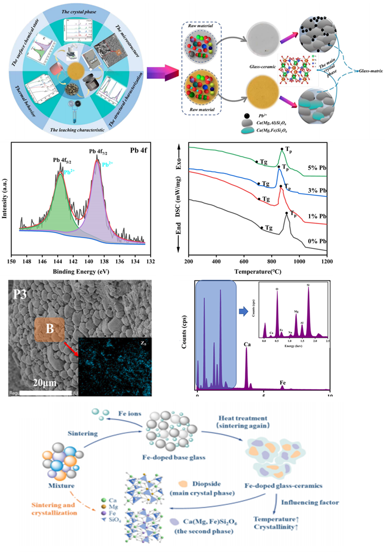 该研究根据硅酸盐三元相图为基础,以透辉石为主晶相进行配比设计。明确了Cu,Zn等重金属在高温重构后的迁移规律与重构机理。同时提出了一种新型的重金属浸出浓度模型,能够精准模拟不同重金属含量下的浸出浓度。该研究是固废建材化的重要技术原型,为解决硅酸盐固废规模化利用和建筑材料巨量天然资源消耗的问题提供关键理论和技术支撑。