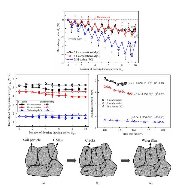 我国分布有大量的软弱土,这些软弱土需经过固化/稳定化技术处理后才能地基承载,石灰和水泥石是软土处理中应用最多的固化剂,且水泥用量和产量逐年增加。然而,固化土体在季节性影响条件下,往往遭受不同程度的冻融循环作用,极大地影响了固化土的应用;水泥存在生产过程能源和资源消耗严重、CO2排放和环境污染大等缺陷。为减少水泥用量和CO2排放,促进CO2在土木建筑领域的碳利用,加快“碳达峰”和“碳中和”,本文用绿色固化材料氧化镁和CO2碳化后的固化土进行冻融循环试验,并与水泥固化土进行对比,研究了氧化镁碳化固化土的冻融耐久性和微观机理。