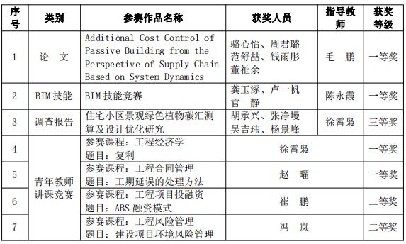 本次大赛充分反映了我院工程管理专业在大学生课外科技创新与青年教师教学能力培养方面所取得的成效,达到了“以赛促教、以赛促学”的目的,学院将进一步完善本科人才培养机制、加大对青年教师的培养力度,争取今后在省级以上更高层次的大学生创新创业竞赛与青年教师讲课竞赛中能取得更好的成绩。