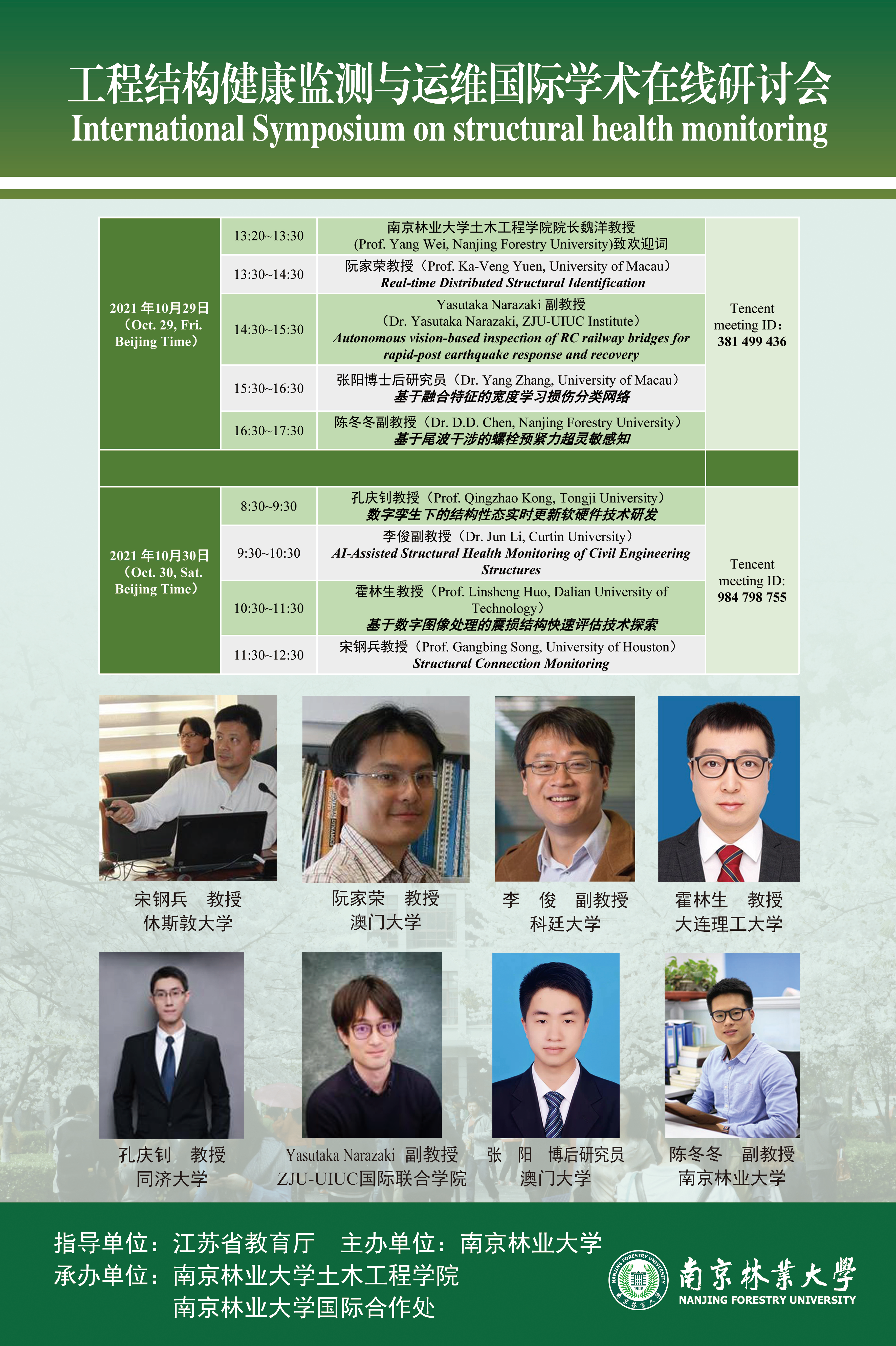 2021年10月29日下午由江苏省教育厅主办,南京林业大学土木工程学院同南京林业大学国际合作处承办的 “水杉”学术讲坛暨工程结构健康监测与运维国际学术在线研讨会顺利开幕,并于2021年10月30日上午圆满结束。