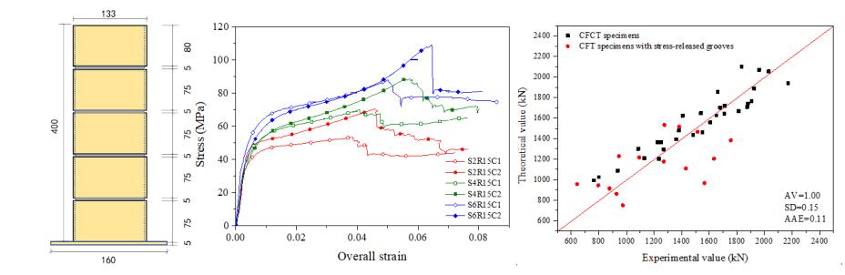 钢管混凝土柱由于其优越的力学性能,广泛应用于工程实际中。当钢管混凝土柱承受纵向荷载时,往往是钢管的屈服导致结构破坏,从而使得钢管约束效应不能完全发挥。同时,由于钢管在复合结构中处于复杂的三向受力状态,难以对钢管环向约束效应进行精细化研究。论文设计了出一种由减压钢管、FRP和混凝土组合构成的FRP-开槽钢复合管约束混凝土柱结构。研究结果表明,该结构的承载能力和延性与FRP层数、倒角半径和钢管厚度密切相关,论文主要针对矩形截面柱展开,结合同期另一项圆形截面柱的研究成果Performance of circular concrete-filled FRP-grooved steel composite tube columns under axial compression(论文链接:https://doi.org/10.3390/polym13213638),建立了既适用于矩形截面,又适用于圆形截面的通用承载力计算模型。
