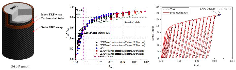 论文提出了一种由FRP-碳钢复合管和海水海砂混凝土(SSC)组成的新型FRP-钢复合管海水海砂混凝土柱(SFSCT),FRP-碳钢复合管是将FRP片材包裹在钢管的内外壁上制成的。碳钢使得结构整体的延性大大提高,为此研究了该结构的循环受力性能,以评估静态抗震性能。研究了塑性应变、刚度退化等关键指标对循环轴压应力-应变行为的影响。研究发现内侧FRP对核心混凝土具有应变可恢复性能,同时可以抑制钢管局部屈曲变形。综合考虑了钢管和FRP的双重约束作用,提出了面向设计的完整的循环轴压应力-应变分析模型。研究结果表明,该新型结构相较于现有FRP-钢组合结构具有更好的循环轴压性能。