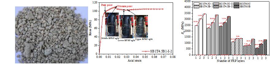论文提出了一种新型FRP-钢复合管约束珊瑚混凝土组合结构(SCCFCTs)。核心混凝土由海砂作为细骨料、珊瑚作为粗骨料和海水作为拌合水浇筑而成组成,FRP-钢复合管由FRP包裹在钢管的内外壁而形成,海水海砂珊瑚骨料混凝土(SSCC)填充于FRP-钢复合管。研究变量为钢管径厚比、FRP层数和FRP类型。根据不同的径厚比,试件的最终破坏模式分为剪切破坏和挤压膨胀破坏,FRP层数的增加和钢管径厚比的减小导致试件的极限承载能力和变形能力显著改善。论文模拟了SCCFCTs在轴压荷载下的完整应力-应变曲线。