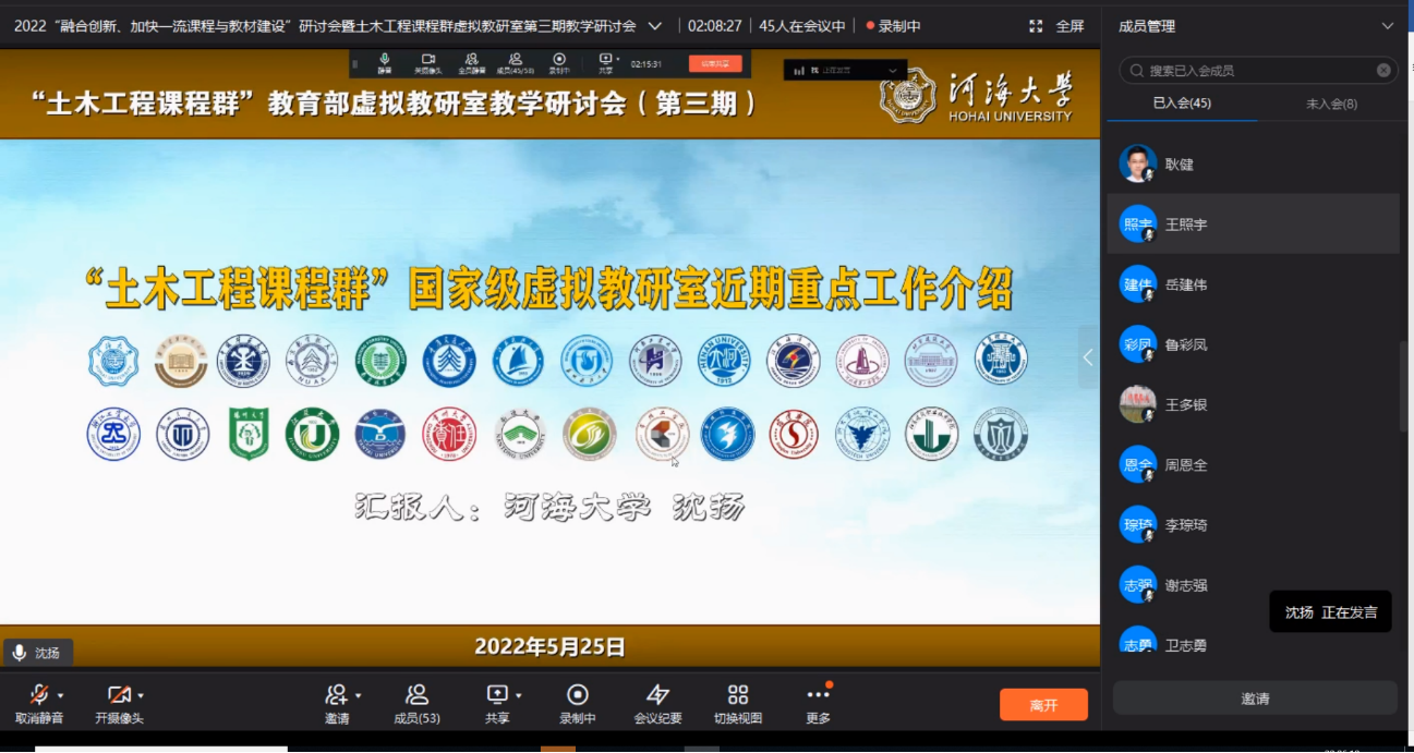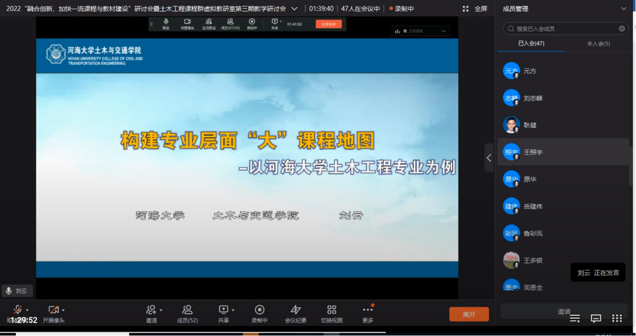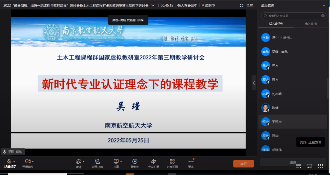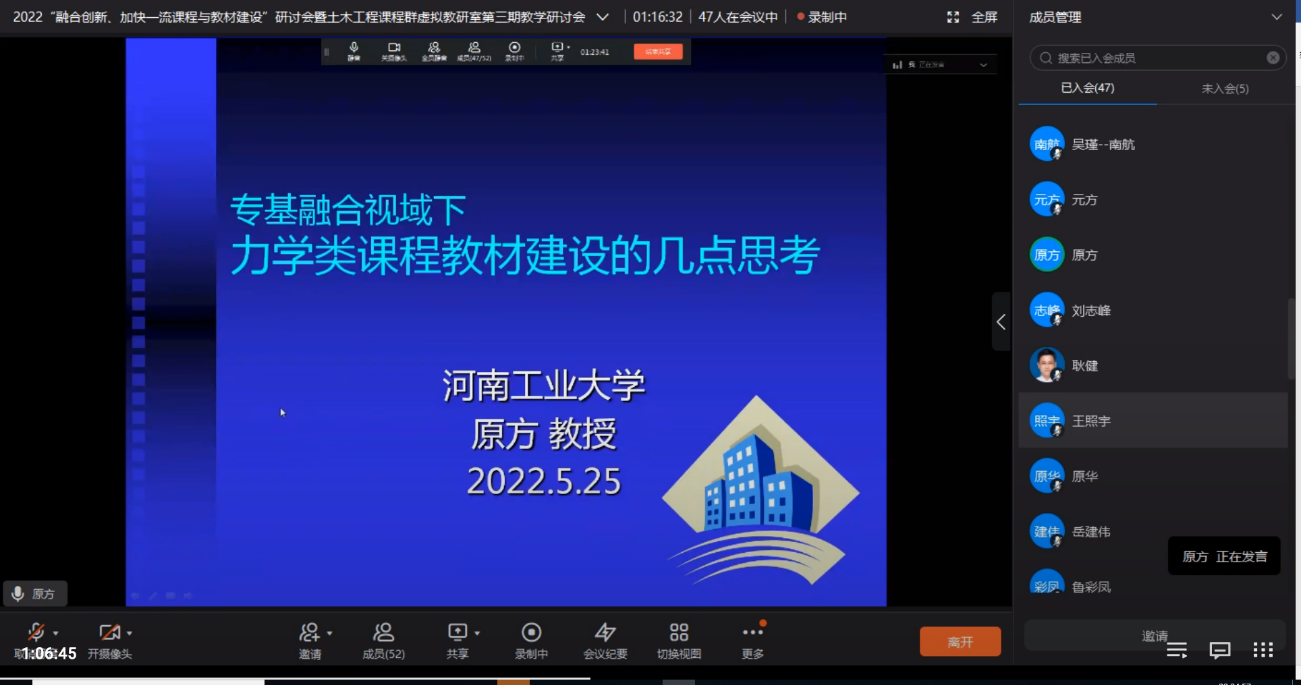 5月25日晚,2022“融合创新、加快一流课程与教材建设”研讨会暨土木工程课程群虚拟教研室第三期教学研讨会顺利召开。本次研讨会共有来自江苏、陕西、重庆、河南、河北、北京、山东、甘肃、浙江等9个省、直辖市的28家成员单位参加。本次会议就土木专业一流课程与教材建设思路做了深入研讨。
