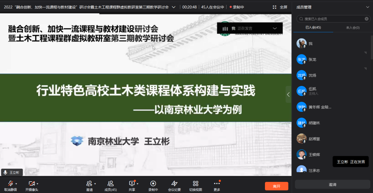 我院教师、校教务处处长王立彬教授应邀参会,并作了题为“行业特色高校土木类课程体系构建与实践——以南京林业大学为例”的大会报告,就我校人才培养理念、顶层设计以及土木类专业人才培养方案修订与课程体系建设等内容做了交流分享,为行业高校土木类课程体系的建设提供了经验与启示。