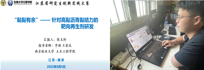 2022年8月4至5日,由江苏省工学4类研究生教育指导委员会主办、东南大学交通学院承办的“江苏省研究生智慧交通运输科研创新实践大赛”于线上举办。根据参赛题目类型,比赛分为交通基础设施和交通工程系统两组分别进行展示和答辩。评委会最终从近20所高校选派的参赛作品中评选出89件入围决赛,我院2020级研究生张文轩、陈硕秋牵头的两组参赛团队(指导老师:李强教授和王家庆老师)分别荣获本次大赛的二等奖和优秀奖。