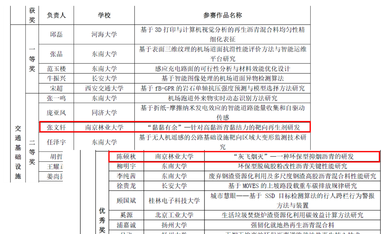 硕士研究生陈硕秋及参赛团队立足国家“双碳战略”,进行环保型烟气自清洁沥青材料的研发,并对不同改性剂组合下沥青材料的烟气排放抑制效果和挥发性气体中有机化合物排放特征进行有效评价。前期研究论文1篇已被SCI期刊录用。