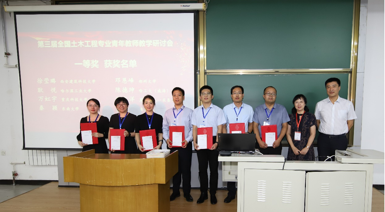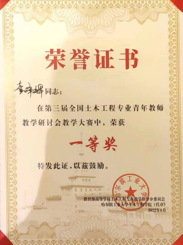 2022年8月13日-17日,第三届全国土木工程专业青年教师教学研讨会暨教学大赛在哈尔滨工业大学举行,本次教学研讨会暨教学大赛由教育部高等学校土木工程专业教学指导分委员会主办。来自哈尔滨工业大学、上海交通大学、东南大学、华南理工大学、南京林业大学等全国知名高校的50余名青年教师参加了教学比赛。教学比赛共分六个小组,每组前两名进入决赛,经过两天的激烈角逐,我院董峰辉老师以小组第一的成绩出线、并在决赛中荣获全国一等奖。