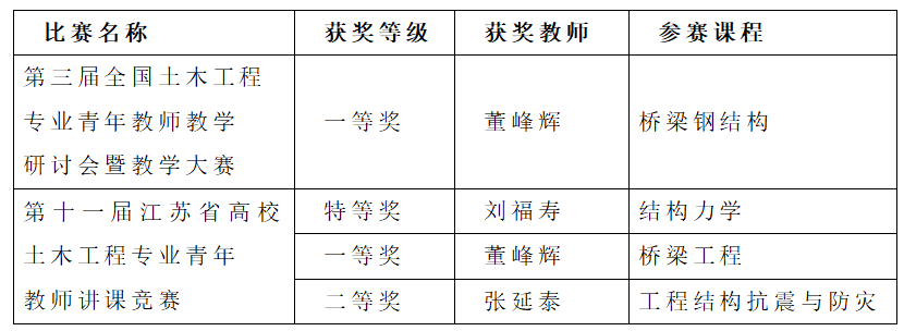2022年8月,土木工程学院选派优秀青年教师参加了第三届全国土木工程专业青年教师教学研讨会暨教学大赛和第十一届江苏省高校土木工程专业青年教师讲课竞赛,并喜获佳绩:获得全国一等奖、省特等奖、省一等奖、省二等奖各1项。