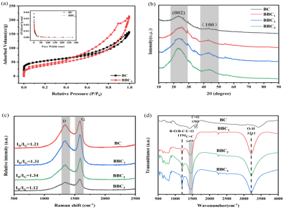 图3 BC和BBC2的 (a)N2吸附-解吸等温线,(b)XRD图谱,(c)拉曼光谱,(d)FT-IR光谱