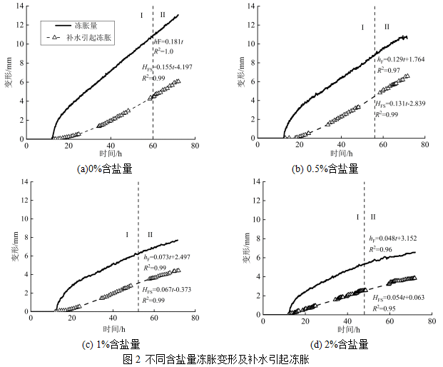 盐分存在降低了孔隙水的冻结温度,并影响土体的冻胀变形,深入研究氯盐土的冻胀特性及其内在机理是人工冻结法在沿海含盐地层海底隧道等地下工程安全施工和后期稳定运营的保证。针对上述科学问题,论文以氯盐粉质黏土为研究对象,通过自制的单向冻结试验装置,研究了在开放系统单向冻结条件下氯盐粉质黏土的冻胀变形特性,并通过实时监测冻结过程中的补水量、未冻水含量、电导率和土水势的变化,揭示了水盐迁移规律;并结合核磁共振试验获得的冻结状态下微观孔径分布,从水盐迁移和微观结构变化规律两方面揭示了冻胀变形机理。研究成果为未来人工冻结法在大规模沿海氯盐地层施工提供了科学依据。
