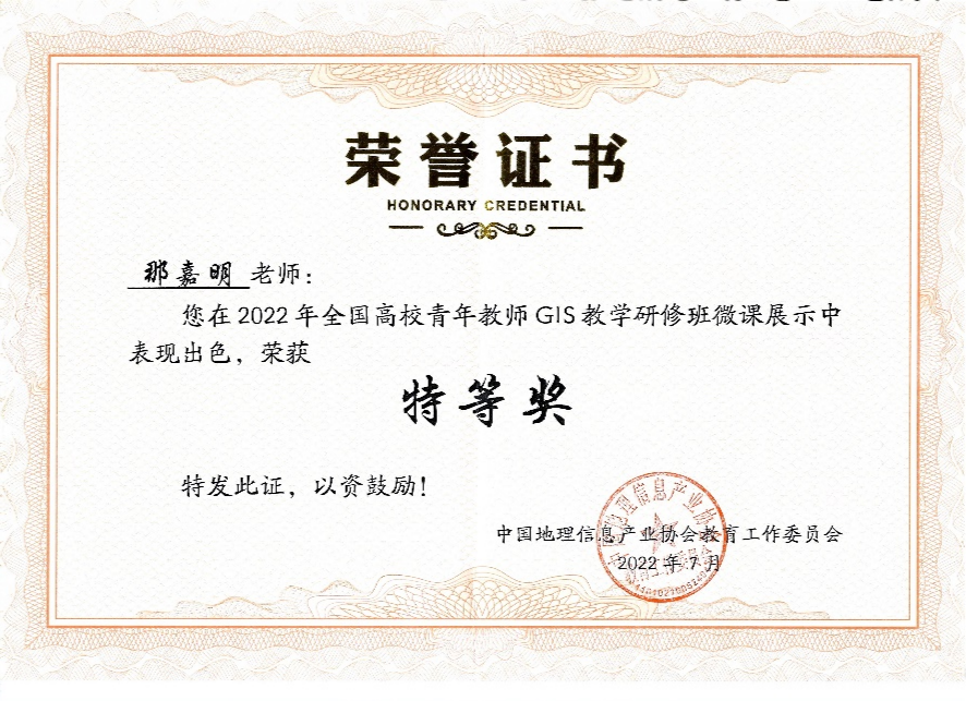 为了全面推动并深化我院测绘工程专业课程教学改革,进一步提高青年教师的教学水平,在学院领导的关心与支持下,学院推荐青年教师那嘉明参加2022年第十一届全国高校青年教师GIS教学研修班,历经5天的紧张学习,我院老师圆满完成了研修班各环节的教学培训任务。研修班还举办了青年教师“微课”比赛,最终经过初赛选拔,来自北京大学、武汉大学、中国矿业大学等20余所高校的30名青年教师入围决赛,那嘉明老师以“数字地形分析——地形特征点提取”为主题荣获特等奖。