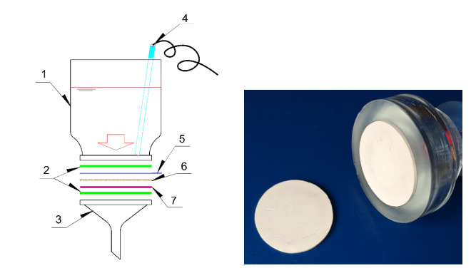 1. 玻璃反应池; 2. 陶瓷膜; 3. 玻璃基座; 4. 参比电极; 5. 钛对电极; 6. 绝缘隔离层; 7. CNT工作电极.