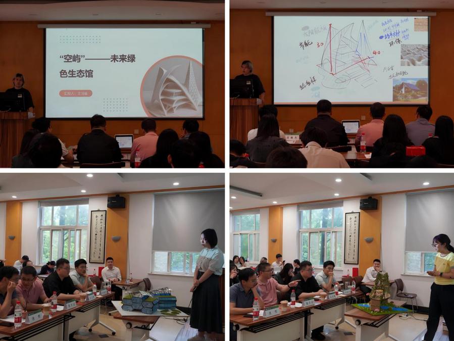 第三阶段,在土木工程学院3324报告厅举行了绿色建筑结构创新作品汇报答辩。本次答辩邀请了中建东方装饰有限公司幕墙中心主任张孔鹏、南京林业大学土木工程学院郑开启、黄林杰、唐煜、周鹏老师作为评委。评委通过小组汇报、专家提问、现场答辩等环节对作品的建筑力学概念、结构概念、创新思维、节能减排、循环经济进行综合考量和评分,最终评选出4个优秀作品进一步完善打磨,并择优推荐到该项赛事的省赛中。