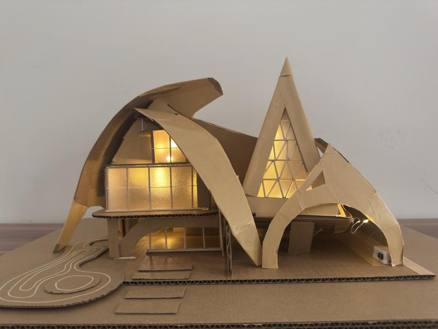 其中获得第一名的“空屿”建筑作品以空间哲学为核心立意,其名寓意深远:“空”既指多层挑空结构与通透镂空设计,亦暗喻空纳万象的意境;“屿”则象征建筑如悬浮孤岛,通过尖塔(抽象山峦)与弧面墙体(拟态云海)的几何叠合,糅合自然意象与现代棱线。作品以垂直通廊串联光影,选用兼具质朴感与现代性的材料,在矛盾形态中实现视觉渗透与精神对话,最终凝练为一座融合自然符号、空间诗性与哲思的艺术构筑。