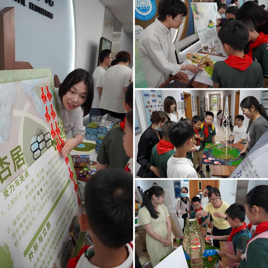 第二阶段,绿色建筑结构创新作品展在土木工程学院院楼内展出。20件精心制作的参赛作品整齐摆放楼道两侧。参赛队员们与现场观众交流互动,热情展示了独特而富有创意的建造模型,详细讲解了他们的创作理念以及所运用的专业知识。随后,由到来的80余名中小学生共同评选出8个“最具人气奖”作品。