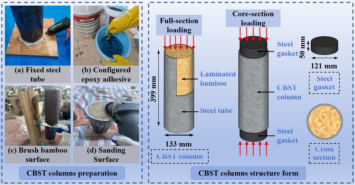 钢管约束胶合竹组合柱作为一种新型组合结构,充分发挥了钢管高强度与竹材高比强度、可再生的双重优势。该结构不仅显著提升了胶合竹的轴压承载力和延性,有效抑制其横向开裂,更减少了建筑行业对高耗能材料的依赖,符合绿色、低碳的建筑可持续发展要求。