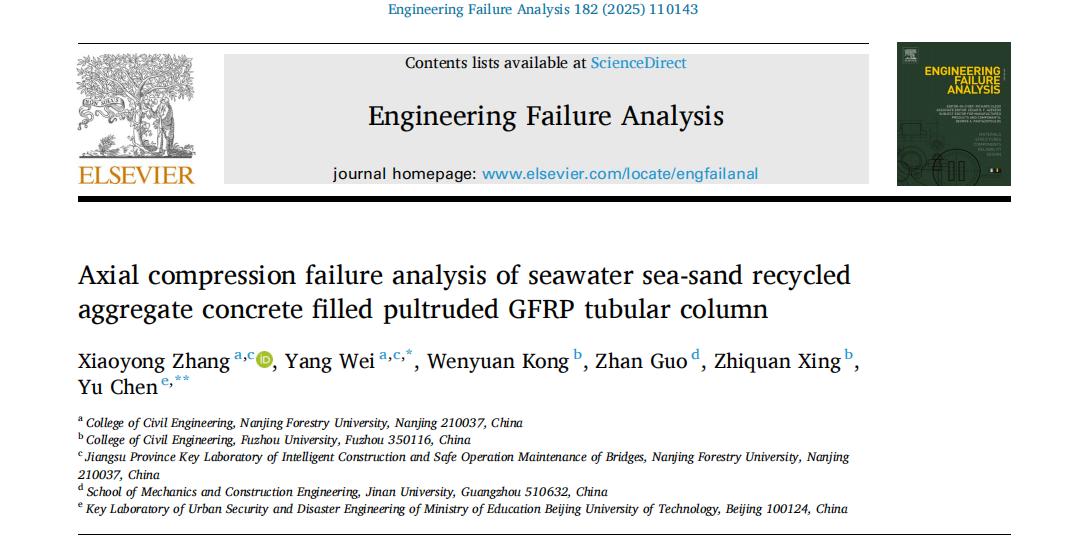 近日,我院张晓勇老师在结构工程领域国际权威期刊《Engineering Failure Analysis》(中科院2区)发表了研究成果(Axial compression failure analysis of seawater sea-sand recycled aggregate concrete filled pultruded GFRP tubular column)。张晓勇老师为第一作者,魏洋教授和北京工业大学陈誉教授为通讯作者,我校为第一完成单位。该成果得到了国家自然科学基金和江苏省自然科学基金等项目的资助。