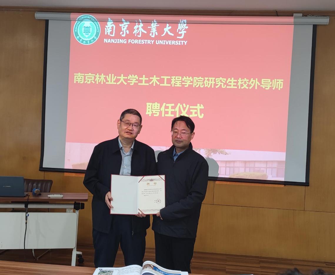 报告会后,学院在报告厅举行了简短而隆重的研究生校外导师聘任仪式,院长魏洋为尹志清总经理颁发“南京林业大学研究生校外导师”聘书。尹总表示,将依托重大工程项目,为研究生提供实习、科研及就业平台,助力学校培养“知规范、懂技术、善经营、会管理”的新时代复合型人才。