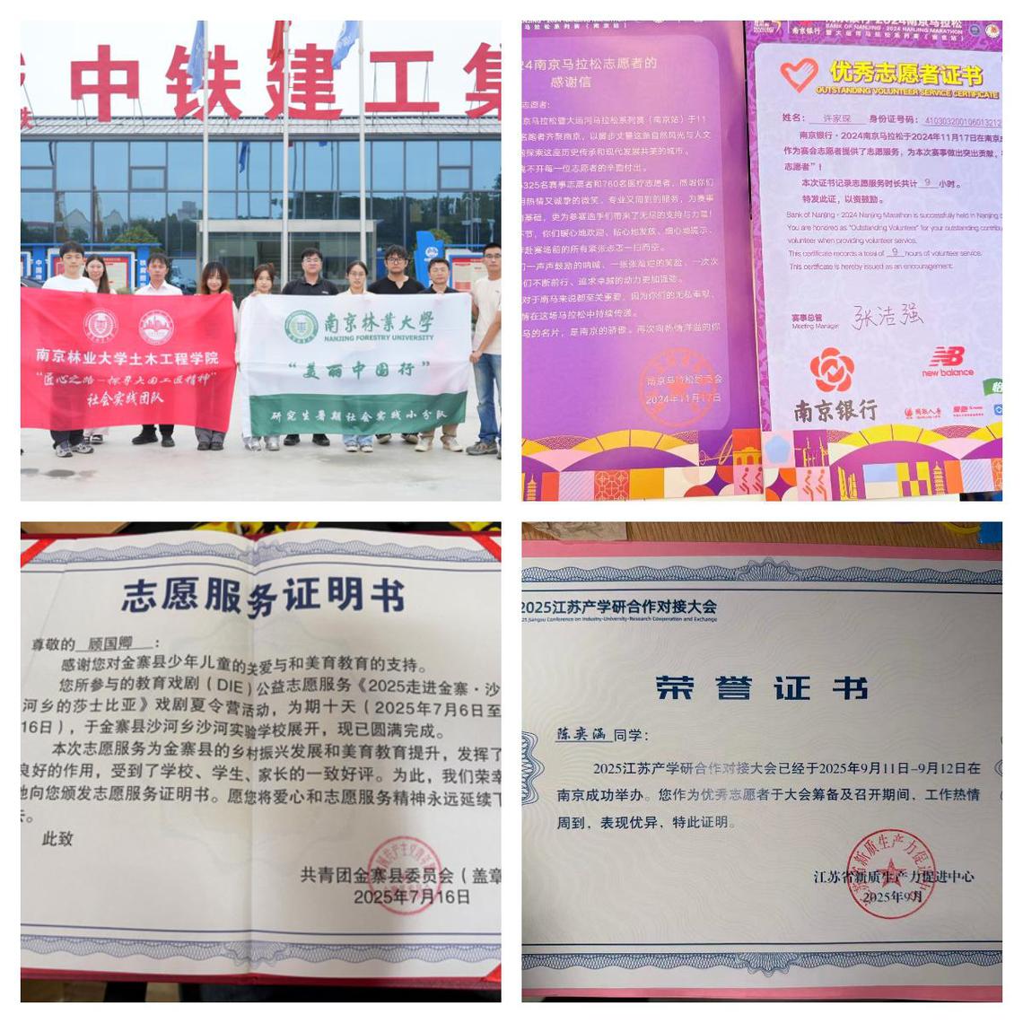 学院研究生会积极动员并鼓励广大同学投身社会实践与公益服务,引导大家将专业知识与实践相结合,在服务社会中提升综合能力。组建“美丽中国行”暑期社会实践团队32个,深入基层一线助力乡村振兴与生态文明建设,其中,2项实践项目获校级二等奖。在公益服务方面,同学们积极投身戏剧夏令营、南京马拉松、江苏产学研合作对接大会等多项志愿服务工作,以饱满的热情保障了各项活动的顺利开展,3名学生获评校“优秀志愿者”,充分彰显了南林研究生的社会责任感和奉献精神。