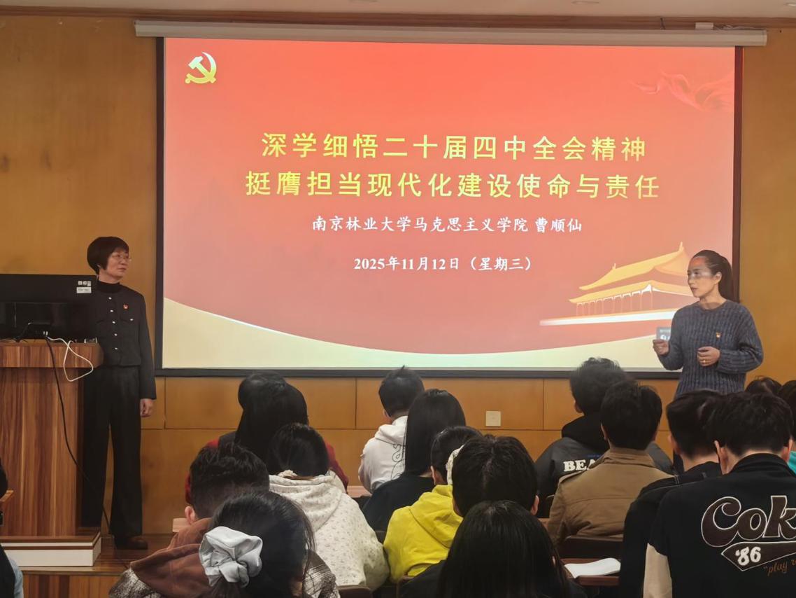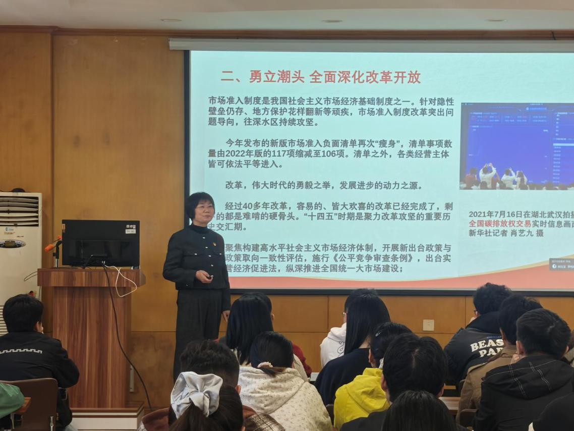 曹教授的党课围绕二十届四中全会精神,从四个方面展开深入讲解:一是回望“十四五”重大成就,运用详实数据和典型案例,展现我国在经济、科技、民生等领域的突破性进展,增强青年对国家发展的认同感;二是面向“十五五”主要目标和战略部署,从多维度解读规划蓝图,引导青年将个人成长融入国家发展大局;三是阐释二十届四中全会提出的新概念、新观点、新论断,生动解析党的理论创新成果,帮助青年把握思想脉络;四是在“接续奋斗中谱写中国式现代化新篇章”部分,号召青年以担当精神投身国家建设,为推进中国式现代化贡献青春力量。