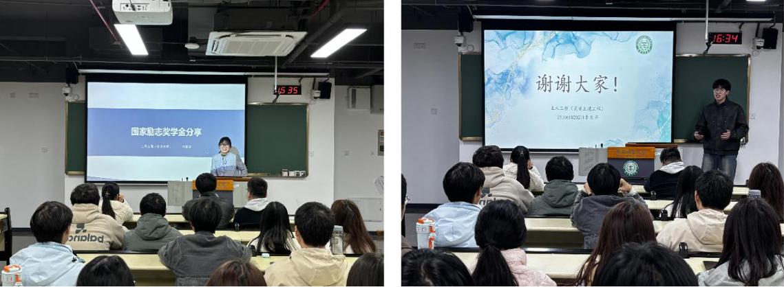 接下来进行的是国家励志奖学金获得者学习经验分享。李天齐同学向大家讲解了综测的计算方法,鼓励大家积极参加各项竞赛志愿活动,充实自己的大学生活;华曼琪同学则向大家分享了国家励志奖学金的获得条件、申请流程等。