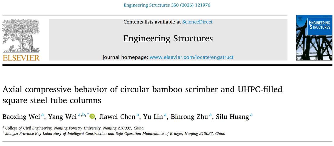 近日,我院魏洋教授课题组在土木工程领域国际著名期刊《Engineering Structures》(中科院一区Top,IF = 6.4)发表了重要研究成果(Axial compressive behavior of circular bamboo scrimber and UHPC-filled square steel tube columns),南京林业大学为第一完成单位,魏洋教授为通讯作者,博士生韦宝幸为第一作者。成果获得了国家自然科学基金项目、江苏省自然科学基金项目等资助。