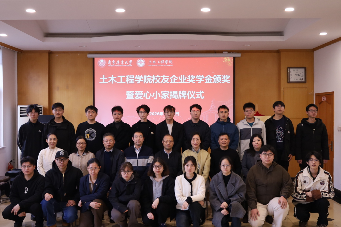 2026年1月15日,南京林业大学土木工程学院在3324报告厅隆重举行校友企业奖学金颁奖暨“爱心小家”揭牌仪式。校工会主席侯波,学生工作部(处)副部(处)长常晓,土木院测绘工程系教师何立恒,中技企业运营管理有限公司副总裁、院校友分会执行会长吉祥以及多位校友企业代表、师生代表共同出席了本次活动。
