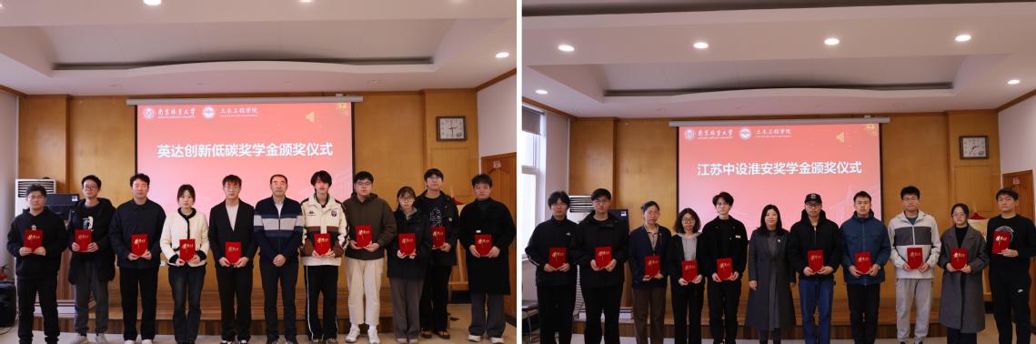 英达创新低碳奖学金和江苏中设淮安奖学金的设立企业代表共同为获奖学生颁发了荣誉证书。