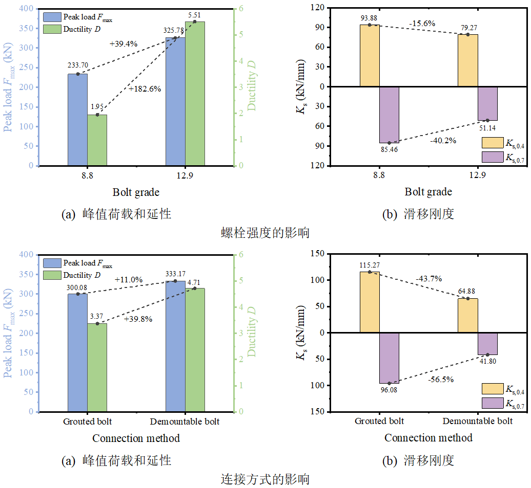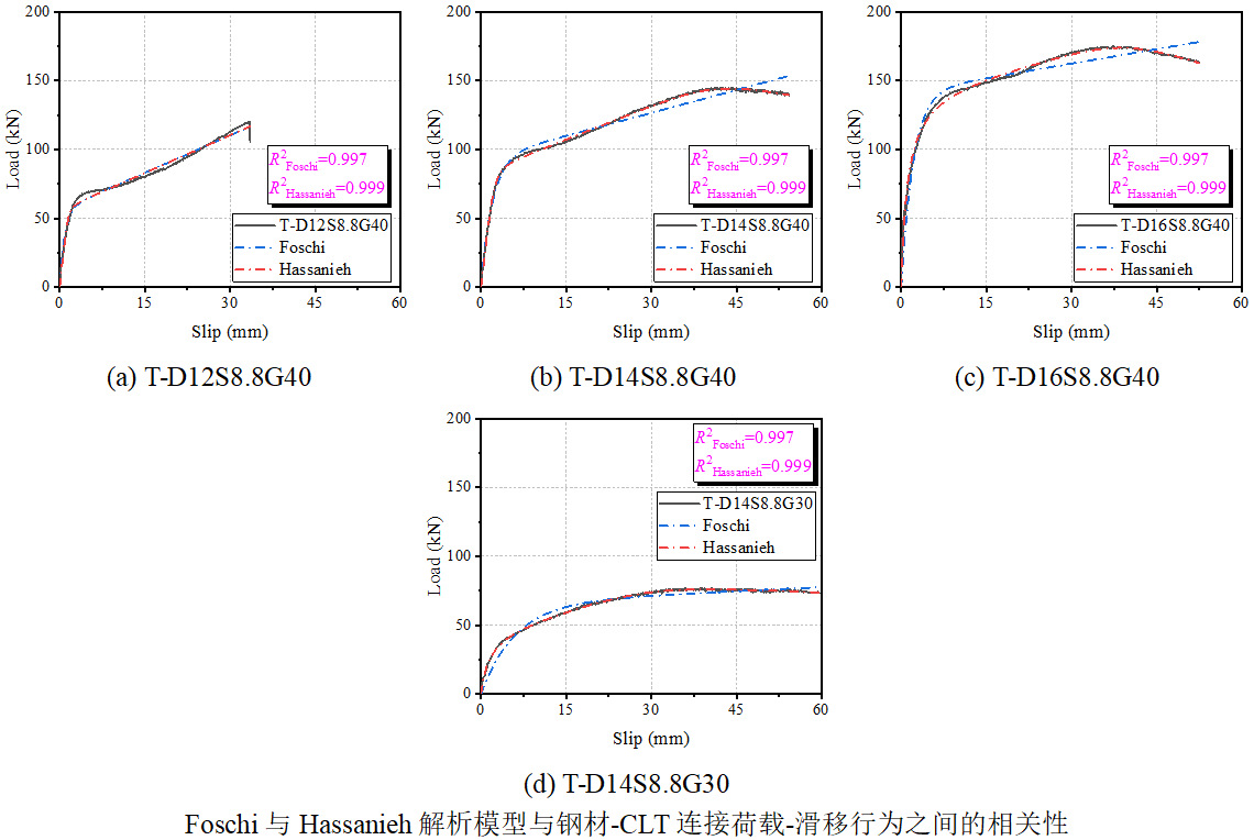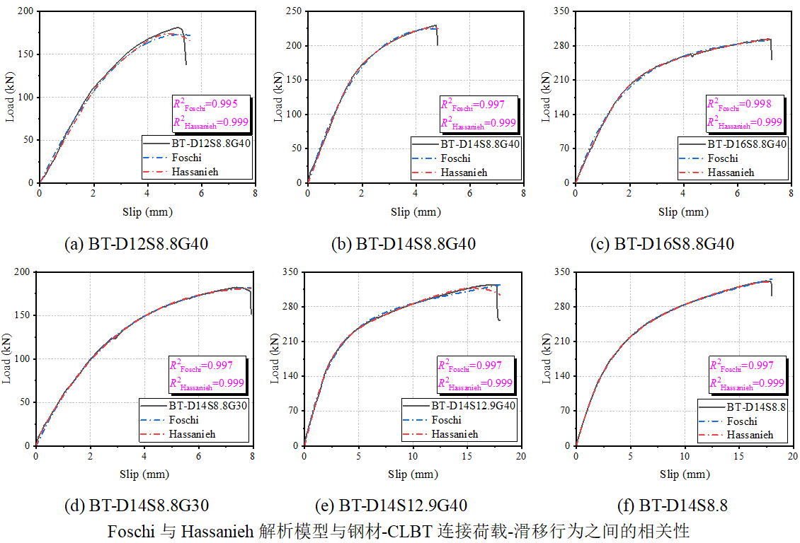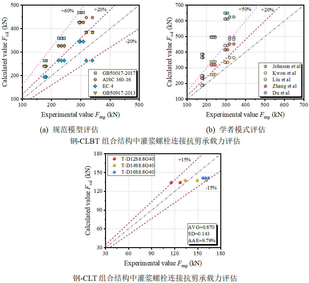 研究结果表明,螺栓嵌入灌浆层中,提高了木材和竹材的嵌入性能。与可拆卸螺栓相比,灌浆螺栓连接的滑移刚度提高2倍以上;此外,钢-CLBT组合结构中灌浆螺栓连接的抗剪承载力和滑移刚度显著优于钢-CLT组合结构,抗剪承载力提升幅度在45%~70%,滑移刚度提升1.8~10倍。相较于CLT板,CLBT板与灌浆层形成更刚性的夹层结构,具备更高的嵌入强度和刚度,防止连接区域灌浆料和竹木的压碎破坏。基于不同的失效模式,论文评估和推导了各类连接的剪切承载力,得出适用的计算模型。最后,通过现有解析模型预测了各类连接的荷载-滑移行为,为未来的钢-CLBT和钢-CLT结构剪力连接件的设计和建模提供参考和思路。