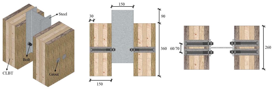 钢-木组合(STC)结构结合了木材的轻质与环保特性,以及钢材的高强度和良好延性,使其成为钢筋混凝土结构的可持续替代方案。随着木材加工技术的发展,正交胶合木(CLT)逐渐成为现代木结构建筑中广泛应用的一类工程木质产品。CLT兼具双向力学性能和良好的尺寸稳定性,成为开发STC结构的理想选择。钢-CLT组合结构协同受力的关键在于剪力连接件的抗剪性能,针对STC结构中常用机械紧固连接件存在较低的滑动刚度和明显的木材嵌入变形问题,本研究提出了嵌入灌浆层的高强螺栓连接技术。
