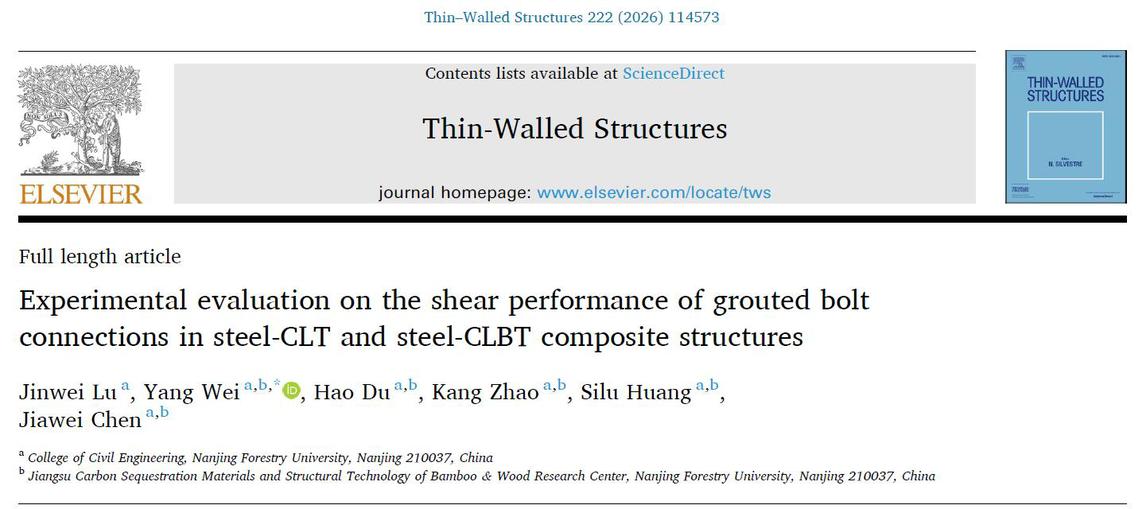 近日,我院魏洋教授团队在土木工程领域国际权威期刊《Thin-Walled Structures》发表了最新研究成果(Experimental evaluation on the shear performance of grouted bolt connections in steel-CLT and steel-CLBT composite structures)。博士生陆金炜为第一作者,魏洋教授为通讯作者,我校为第一完成单位。该成果得到了国家自然科学基金的资助。