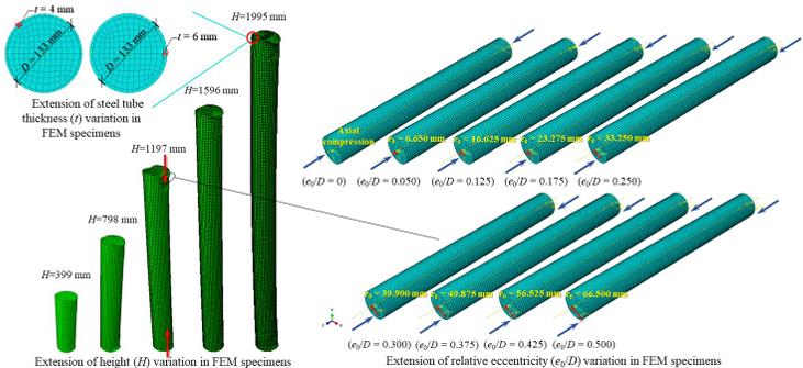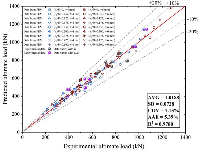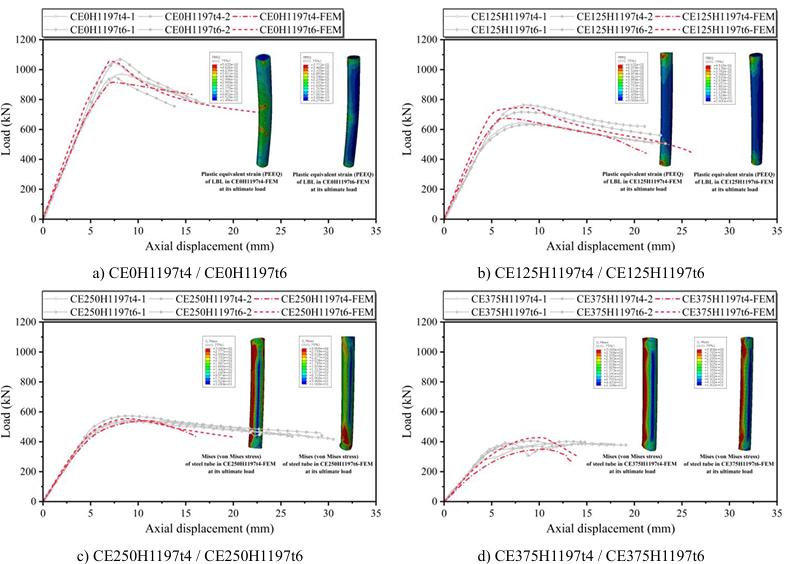 针对这一问题,课题组采用“试验研究+数值模拟”相结合的方法,系统揭示了LBST柱在偏心受压状态下的力学性能与破坏机理。研究完成了28个LBST试件的单轴偏心受压试验,重点分析了长细比(λ)、相对偏心率(e0/D)和钢管壁厚(t)等关键参数对极限承载力、破坏模式及延性的影响。为进一步拓展参数范围,建立了高保真的有限元(FE)模型,开展了74种工况的参数化分析,验证了模型在广泛参数空间内的可靠性。
