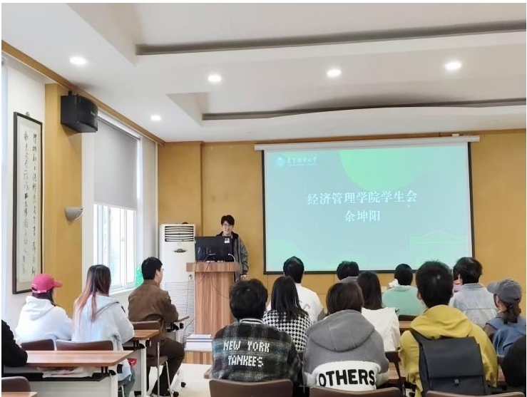 经济管理学院学生会主席余坤阳的分享则聚焦于演示文稿的“内功心法”。他从学生组织常用的汇报、答辩、展示等场景切入,系统阐述了打造一份优秀PPT的全流程。首先,他强调了逻辑先行的重要性,指出清晰的叙事结构远比炫目的动画更为关键。其次,他分享了如何利用学校官方模板、配色方案及SmartArt图形,在短时间内构建专业、规范且美观的视觉呈现。最后,他还结合自身答辩经验,讲解了如何通过PPT配合演讲节奏,实现内容与表达的无缝衔接,达到最佳的展示效果。