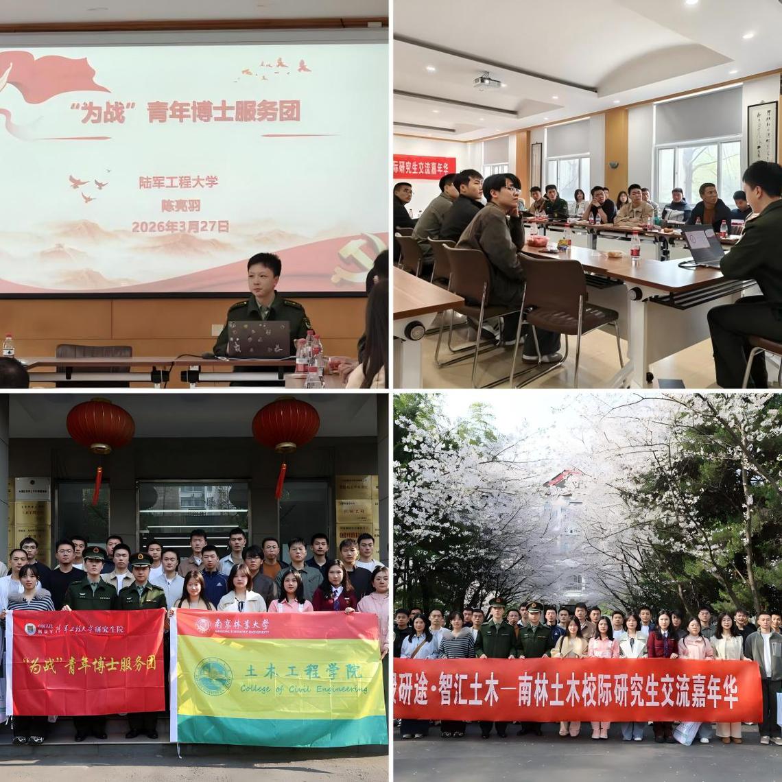 春有樱花缀研途,心有家国赴新程。为搭建校际学术交流平台,增进高校间学科互动与友谊,近日,南京林业大学土木工程学院成功举办“樱缀沿途·智慧土木”校际研究生交流嘉年华活动。本次活动由南京林业大学土木工程学院主办,陆军工程大学应邀参与,两校研究生代表齐聚南林,共话学术成长,共赏樱园盛景,共促合作发展。